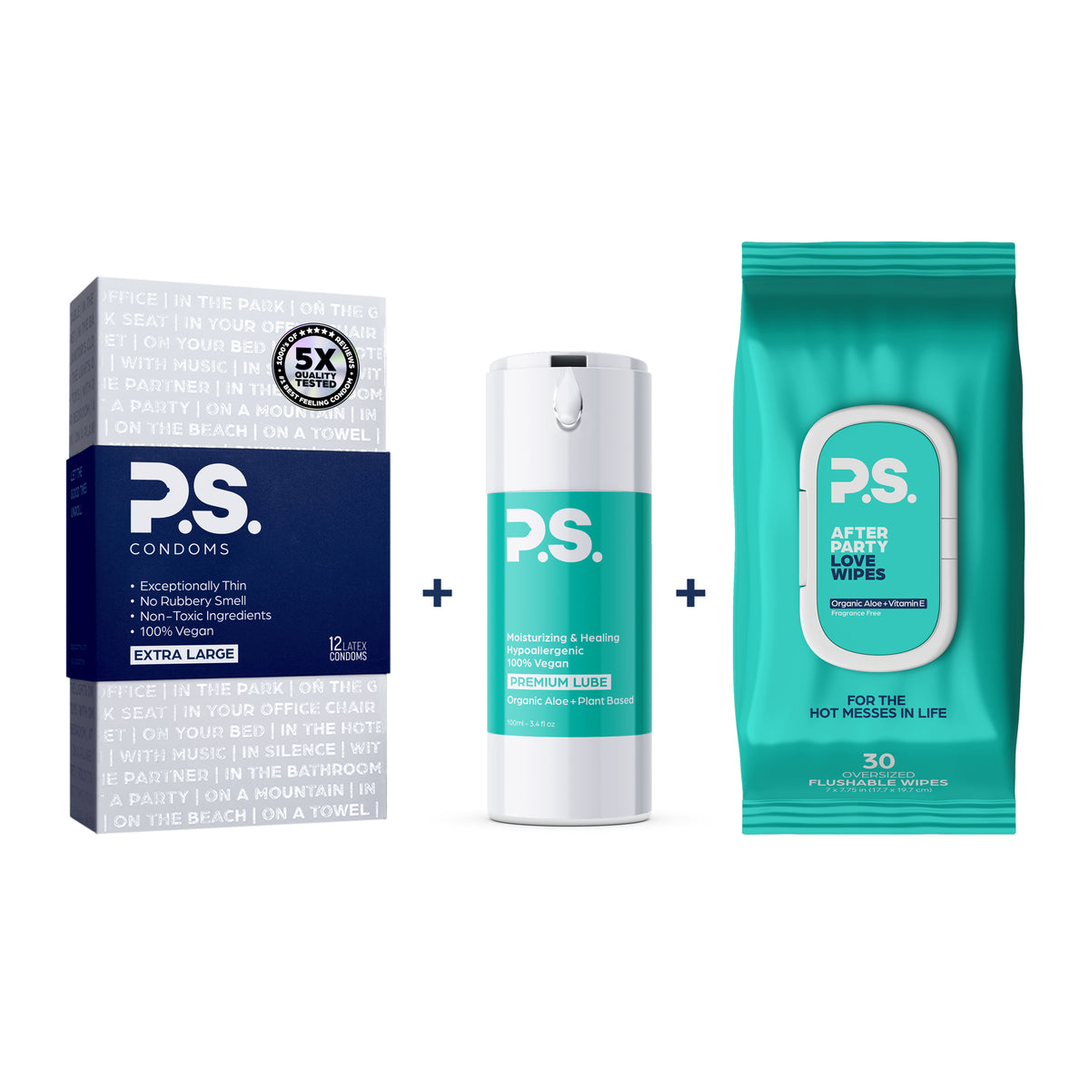 P.S. Condoms are made with all natural rubber latex, using a proprietary distillation process for a smoother and softer condom. Unlike most major condom brands, our condoms are 100% Vegan, and do not contain the animal protein casein. P.S. condoms are lubricated with premium medical-grade silicone, and do not contain parabens, glycerin, bisphenol-A (BPA), gluten, or nitrosamines.
