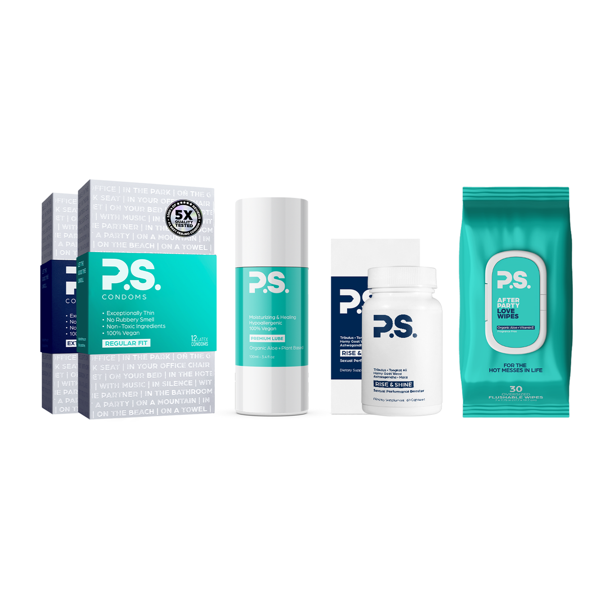P.S.condoms are made with all natural rubber latex,using a proprietary distillation process for a smoother and softer condom. Unlike most major condom brands, our condoms are 100% Vegan, and do not contain the animal protein casein. P.S condoms are lubricated with premium medical-grade silicone, and do not contain parabens, glycerin, bisphenol-A(BPA), gluten, or nitrosamines.
