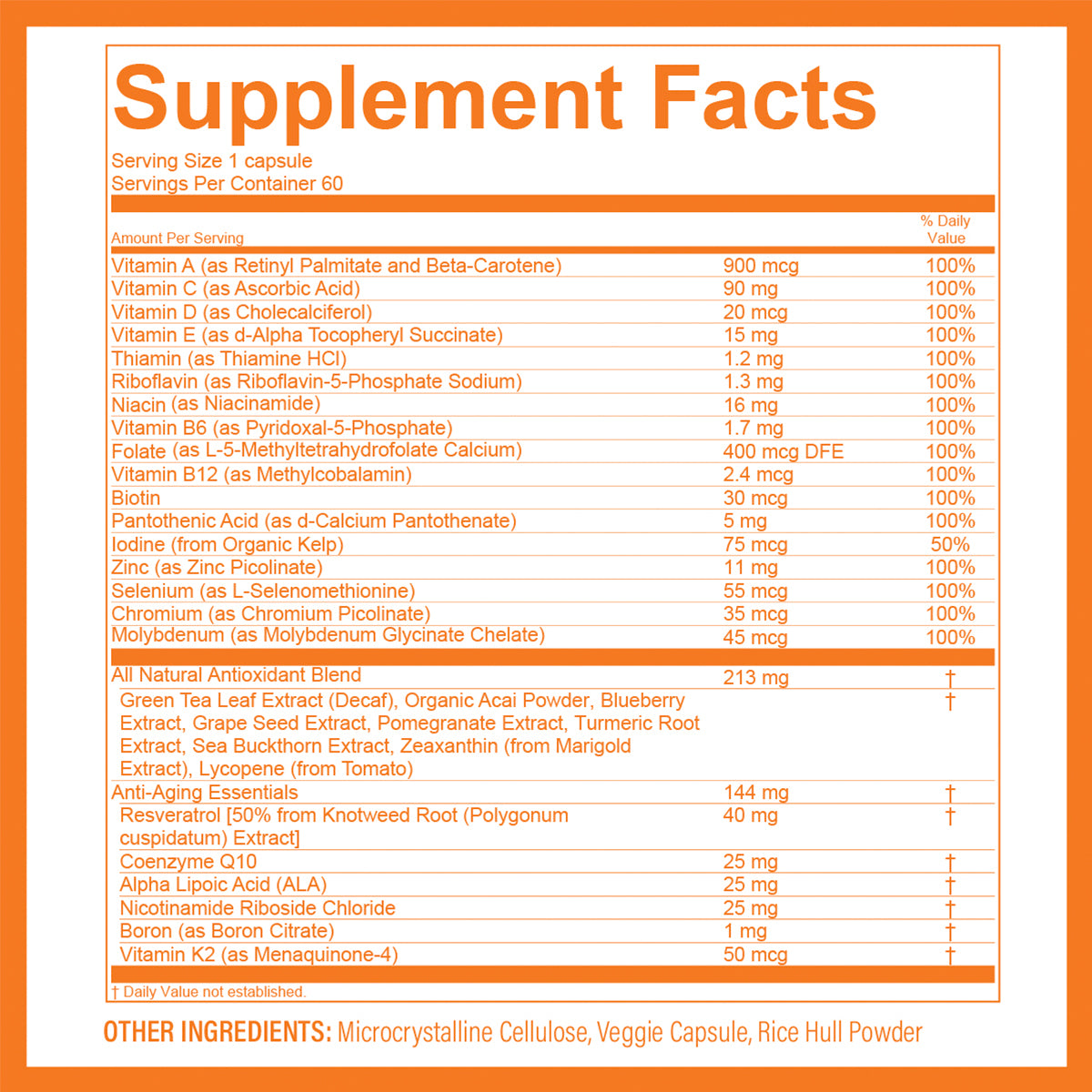 Just one Longevity Multivitamin a day gives you an array of antioxidants like Vitamins A, C, E, polyphenols, flavonoids, lipoic acids and beta carotenes so you can be around longer for those who matter.